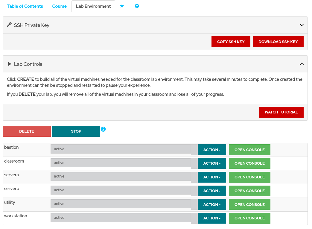 Several systems in the classroom provide supporting services. Two servers, content.example.com and materials.example.com, are sources for software and lab materials in hands-on activities. Information about how to use these servers is provided in the instructions for those activities. The workstation virtual machine provides these activities. Both the classroom and bastion machines must always be running for the proper use of the lab environment.